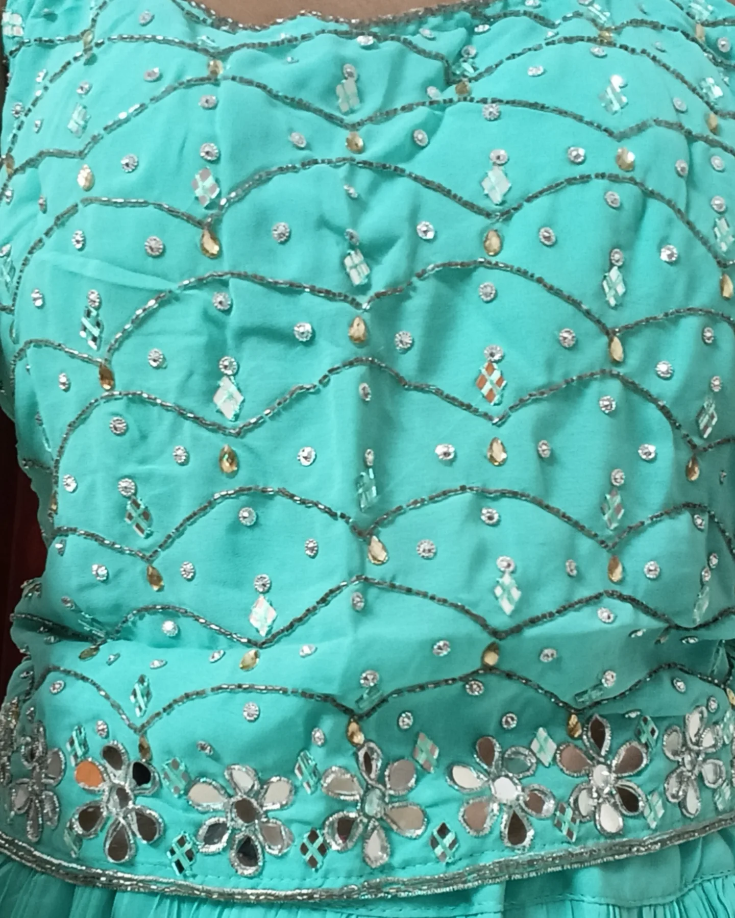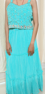 ” Get ready to shine with this stunning party wear set ! The heavy flair skirt and heavily stoned top create a truly mesmerizing look perfect for weddings, parties and special occasions. “